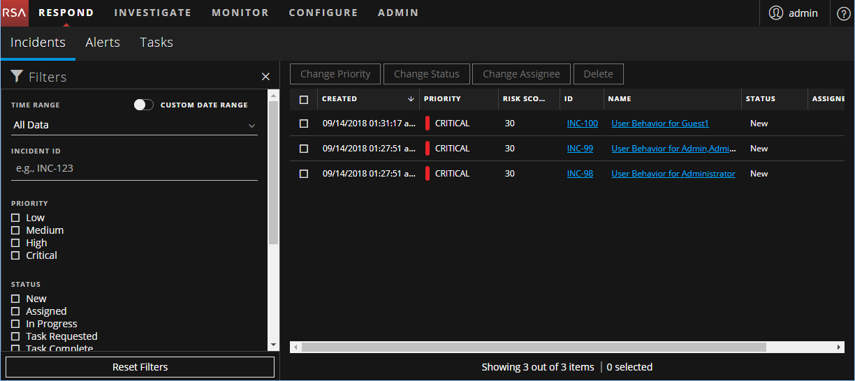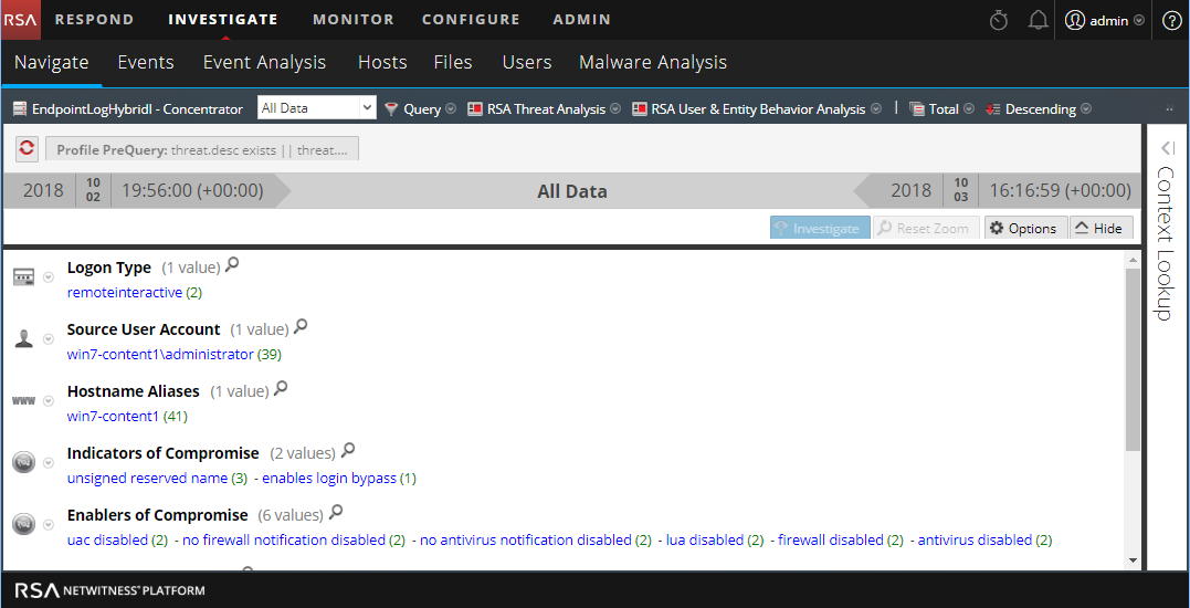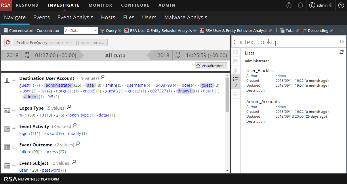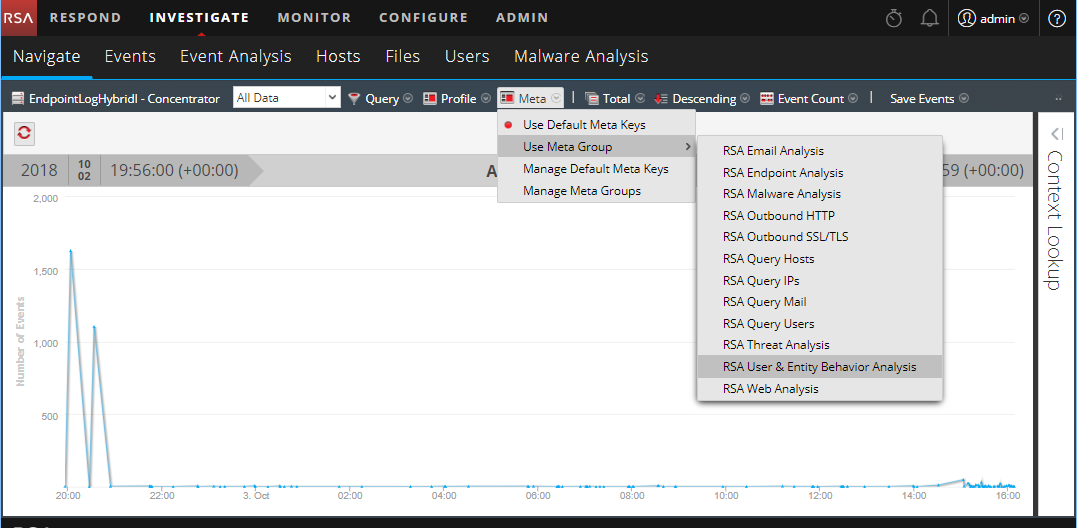To start your investigation, go to INVESTIGATE > Navigate > Load Values. Then, in the Meta drop-down menu, choose Use Meta Group > RSA User & Entity Behavior Analysis.