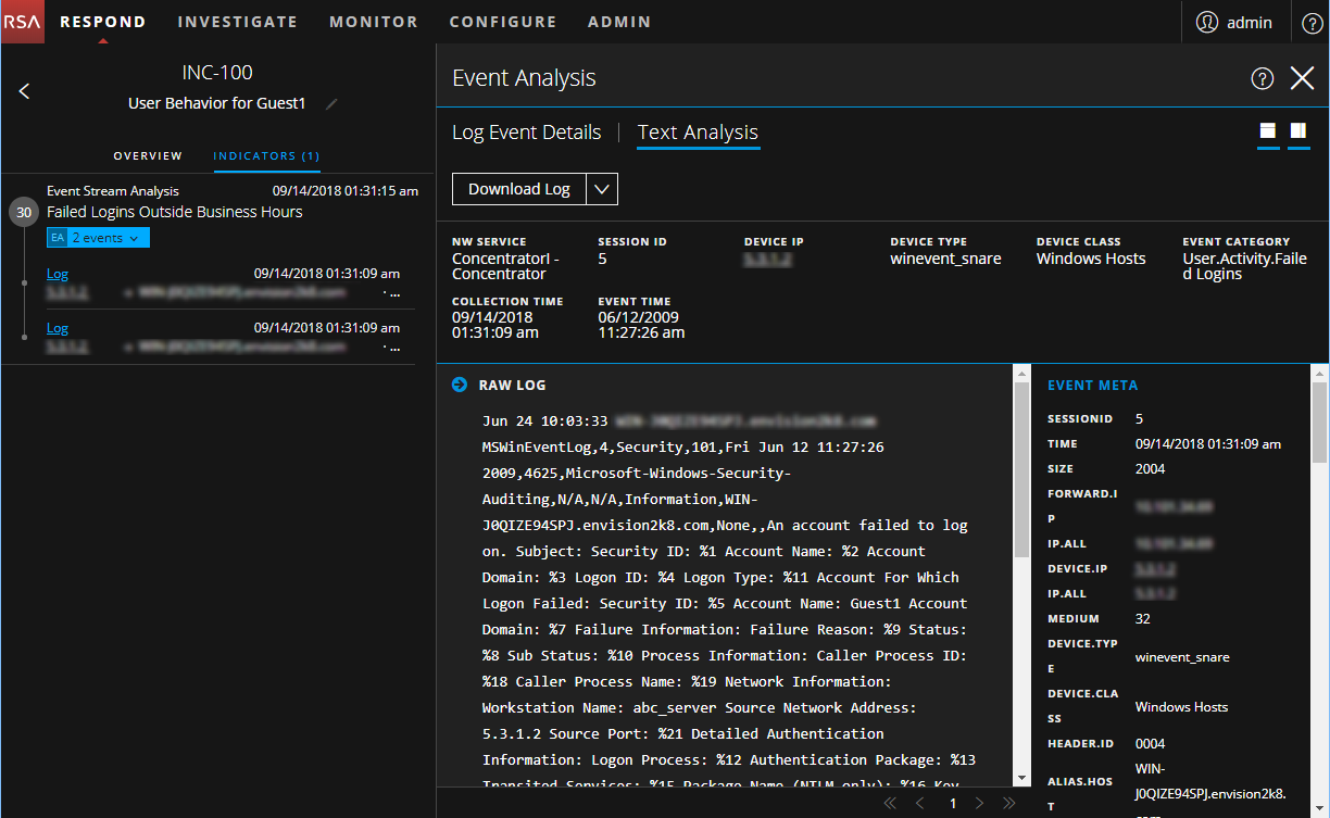 Click Log for an event to display the raw log information as well as event meta for the selected event.