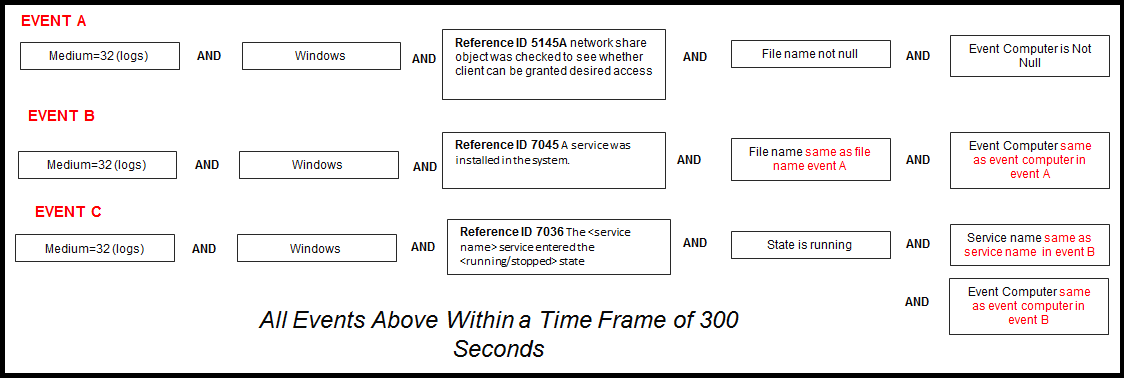 Detects within a Windows environment a sequence of events in which an executable is copied to a file share, the executable is used to create a new service and the service is started within 5 minutes. The sequence of events may indicate an attacker moving laterally by executing a backdoor on a victim machine from an already compromised system.
