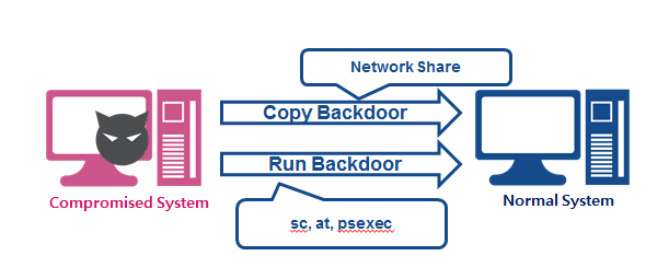 The figure below shows the typical flow of an attacker using elevated privileges or via pass-the-hash, using a network share point to copy a backdoor and execute that backdoor either through a scheduled service, job or other tool for remote execution.