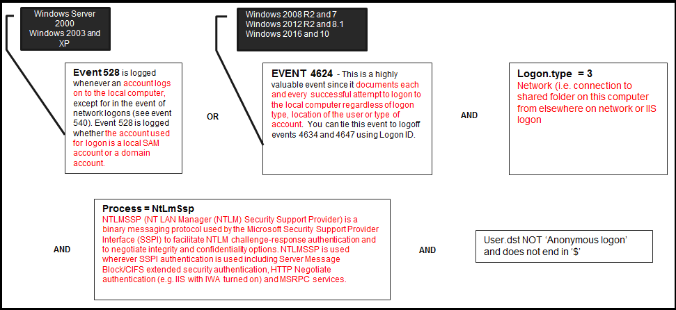 name=nw30060 rule="reference.id='528',’540’,'4624' && logon.type='3' && process='NtLmSsp' && user.dst!='ANONYMOUS LOGON' && NOT(user.dst ends '$')"