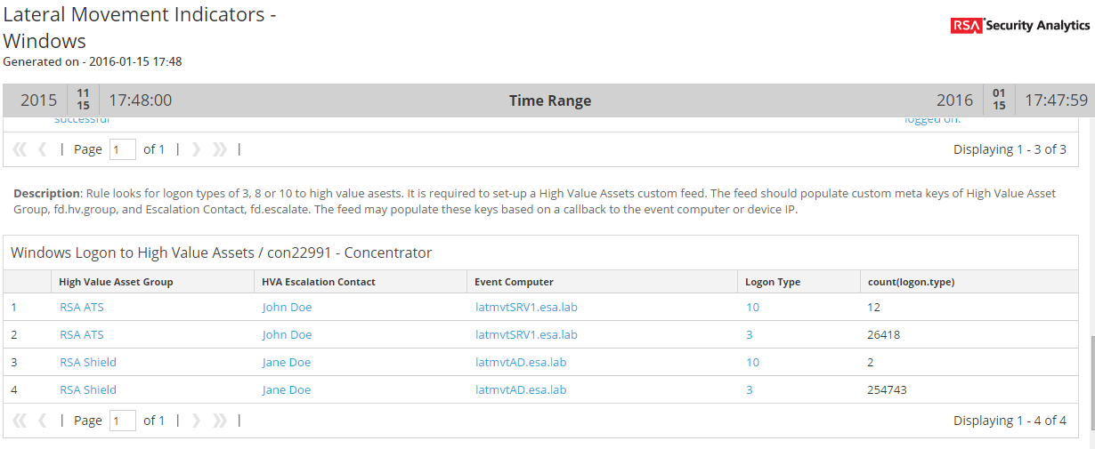 The third report rule, Windows Logon to High Value Assets, is meant to summarize logons by high value assets so that anomalies may be determined. The high value assets are determined through a custom feed that populates custom meta keys of fd.hva.group and fd.escalate based on a callback to the event.computer (or device.ip) meta key.