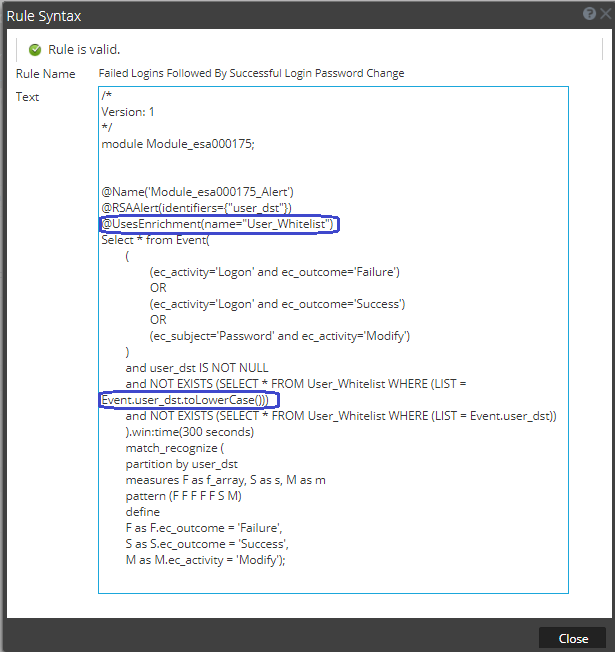 Look over the syntax to get a sense of the EPL for this rule. When finished, click Close to close the Rule Syntax dialog box.