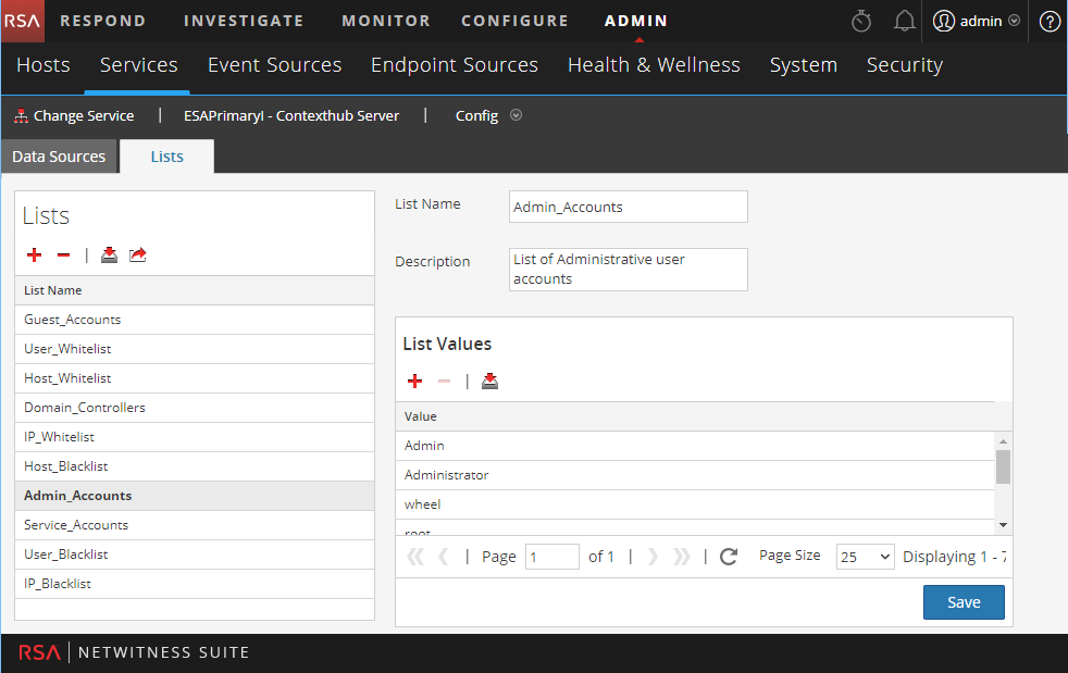- Admin_Accounts: A list of privileged user accounts that should be included for monitoring within rules configured to use it.