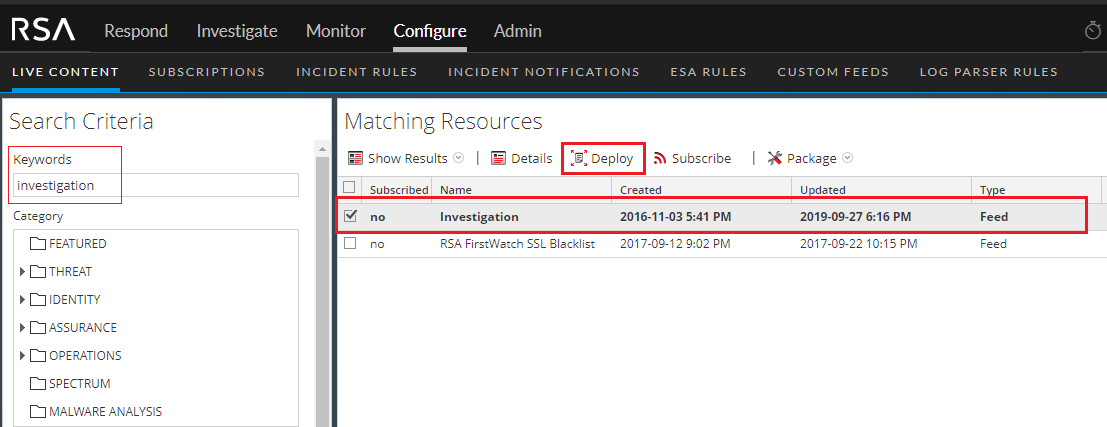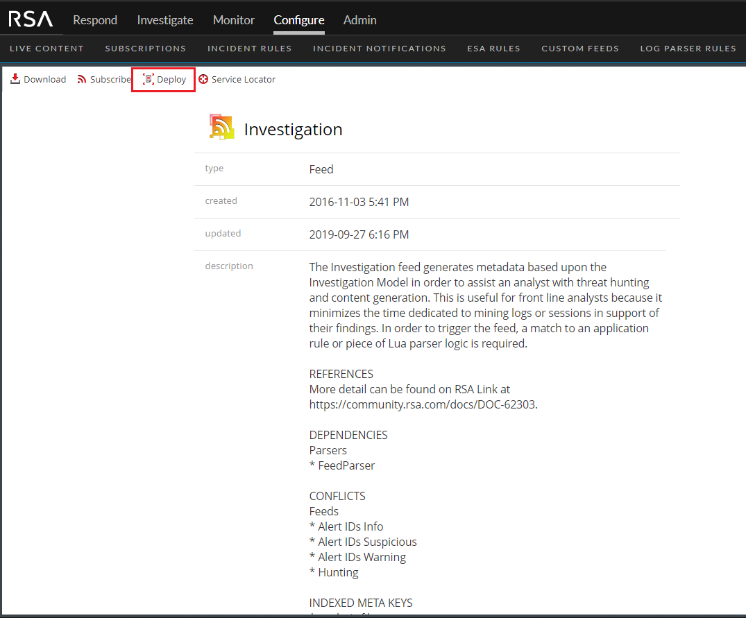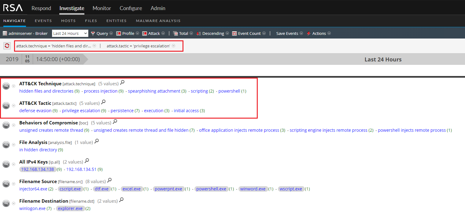 The Investigation Feed generates the metadata for the MITRE ATT&CKTM framework for RSA Application Rules and RSA Lua Parser logic. The keys ATT&CK Tactic and ATT&CK Technique are populated on a match to an out-of-the-box rule.