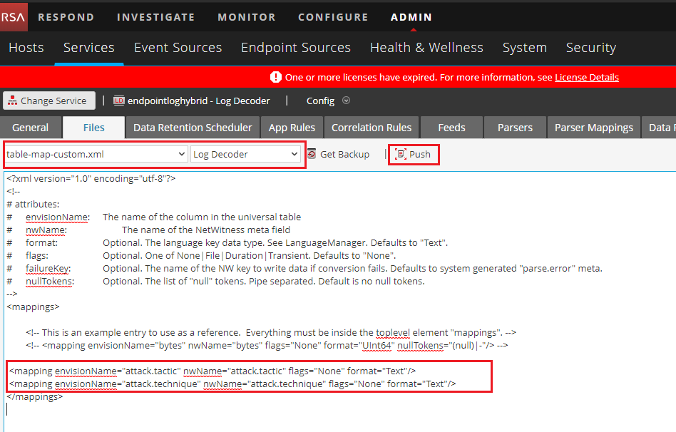 Add the custom keys, ATT&CK Tactic and ATT&CK Technique, to the table-map-custom.xml file on the Decoder.