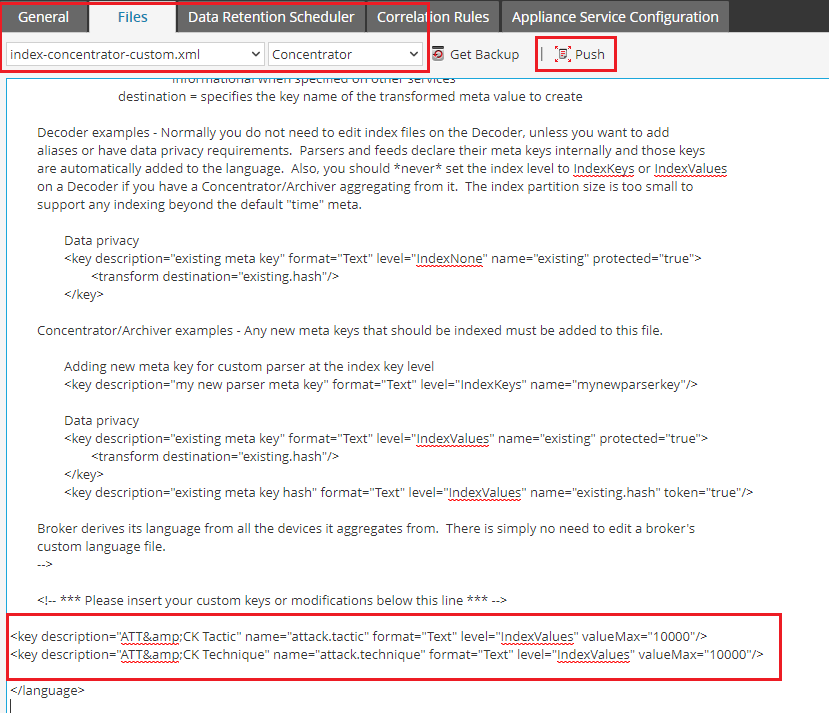Add the custom keys, ATT&CK Tactic and ATT&CK Technique, to the Concentrator custom index file.