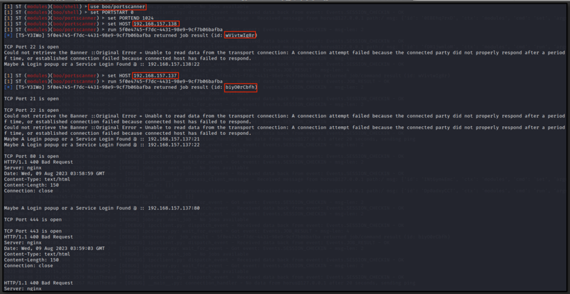 Following the enumeration phase, the attacker conducted a network reconnaissance upon 2 target systems, leveraging the port scanner attack module embedded in SILENTTRINITY Framework.