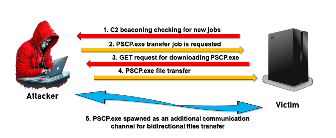 After which, the attacker decided to expand his attack arsenal by moving pscp.exe (PuTTY Secure Copy Protocol) from the C2 server to the victim machine, so as to be utilized as an additional channel for files transfer and/or data exfiltration. The attacker renamed the moved pscp.exe to svchost.exe, resembling same naming convention of legitimate windows system process svchost.exe.
