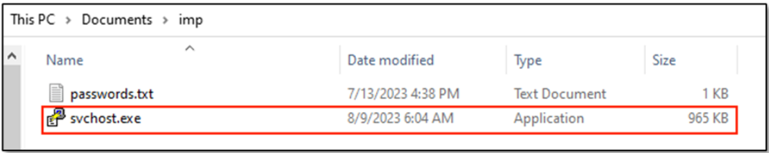 In addition, the attacker showed interest in locally enumerating the contents of the user’s Documents folder, where an interesting folder called imp was discovered having a file named passwords.txt. The attacker decided to exfiltrate such file for the hope of gaining further access through saved up credentials.