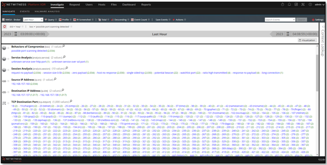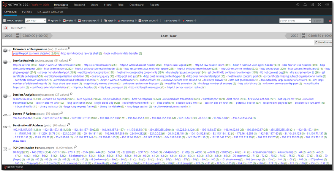 From NetWitness Packets (NWP) perspective and during frequent hunting activities performed, the analyst observed a possible port scanning detected as shown under the Behaviors of Compromise (boc) meta key.