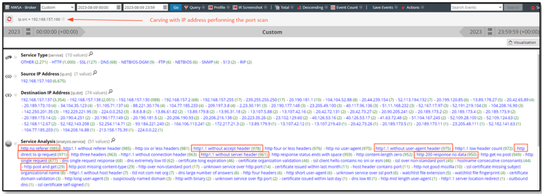 NetWitness Packets makes it possible to pull apart characteristics of HTTP traffic through the Service Analysis meta key. The analyst notices some interesting meta values that can be leveraged to carve the dataset, when focusing the search with ip.src=192.168.157.160, which originated the port scan activity.