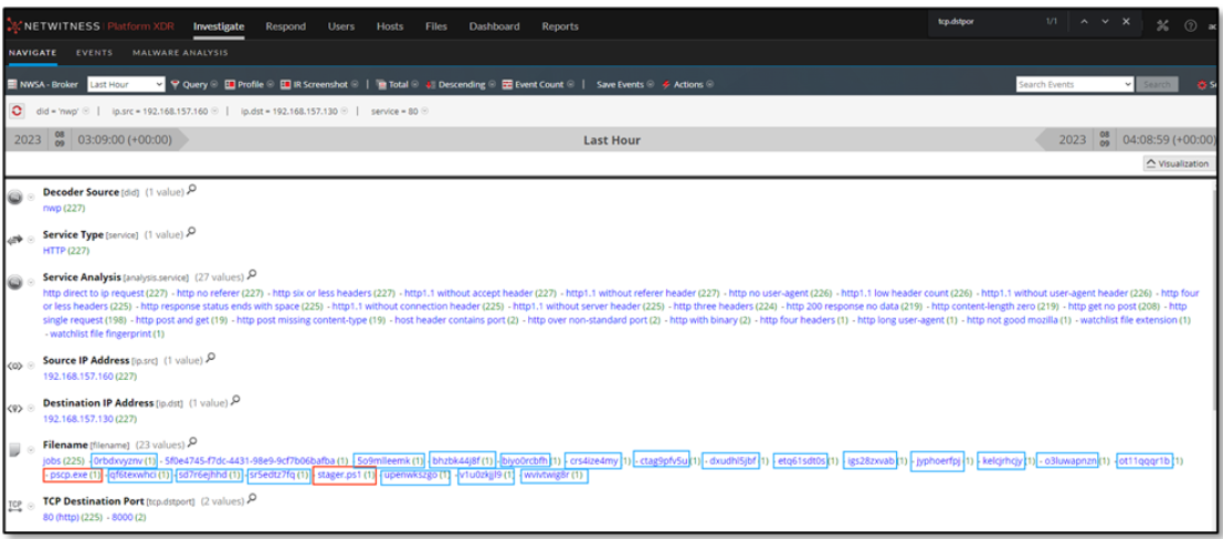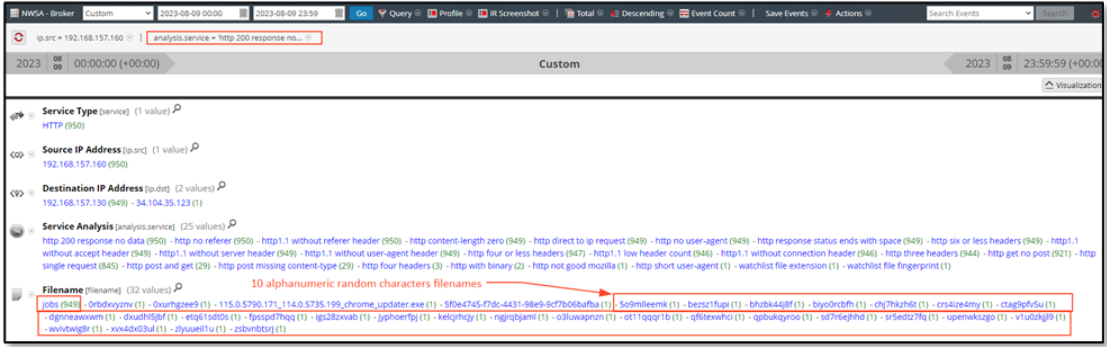 Through further data carving with one of the Analysis Service values, http 200 response no data, the analyst discovers multiple filenames associated with such communication, with a random naming convention comprised of 10 alphanumeric characters. Also, most of the communication was targeting destination IP address 192.168.157.130. This intrigues the analyst to dig deeper into such sessions for unfolding more evidence.