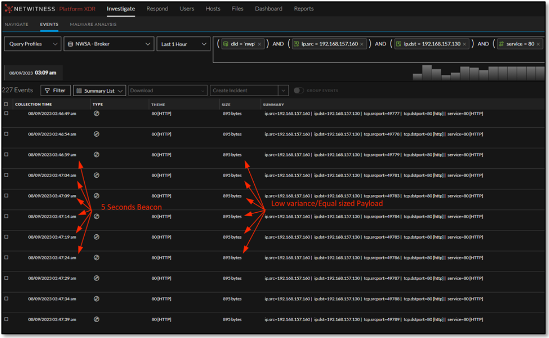 The analyst focused the investigations on the above subject machine and observed a beaconing-like behavior every 5 seconds where this endpoint communicates with IP address 192.168.157.130. It is worth nothing that neither of the IP addresses is of particular interest as they are only valid for this lab simulation.