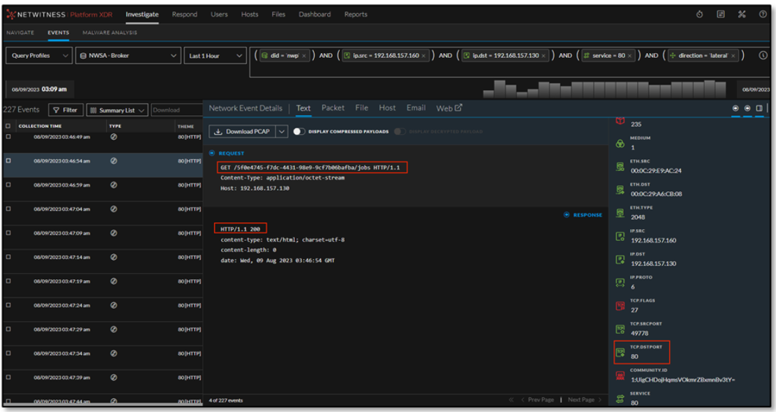 NetWitness Incident Response team analyzed the HTTP Listener profile, and it was concluded that the injected malicious payload on victim side communicates with HTTP GET/POST requests methods with the C2 attack server. The GET request headers are configured to fetch any pending jobs (tasks) assigned for the GUID of the victim, for execution and responding back with a POST request method for the respective output. The POST requests include a Job ID (10 alphanumeric random characters) that corresponds to the command (job) created on the C2 server.