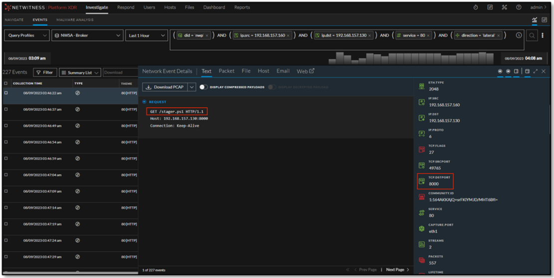 The analyst performed appropriate data carving, focusing on communication between the subject machine and destination IP address and discovered a lot of HTTP traffic being exchanged. Raw packet analysis was performed on one of the events accompanied by an HTTP GET request, and a PowerShell script stager.ps1 was discovered to be downloaded and as highlighted in below figure.