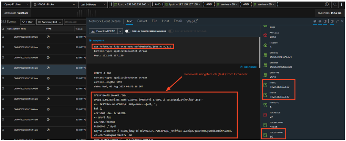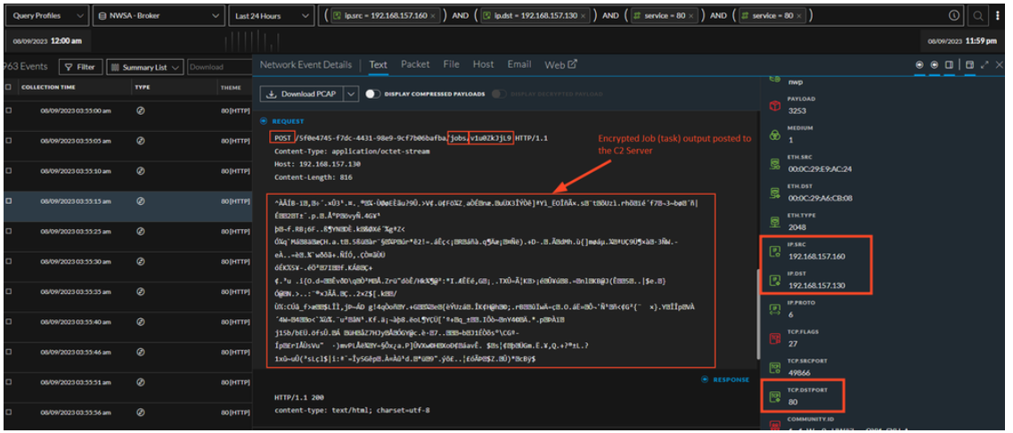 Subsequently, the above event is directly followed by a POST HTTP method by the endpoint with a Job ID comprised of 10 alphanumeric random characters, which is associated to the output of previously communicated C2 command.