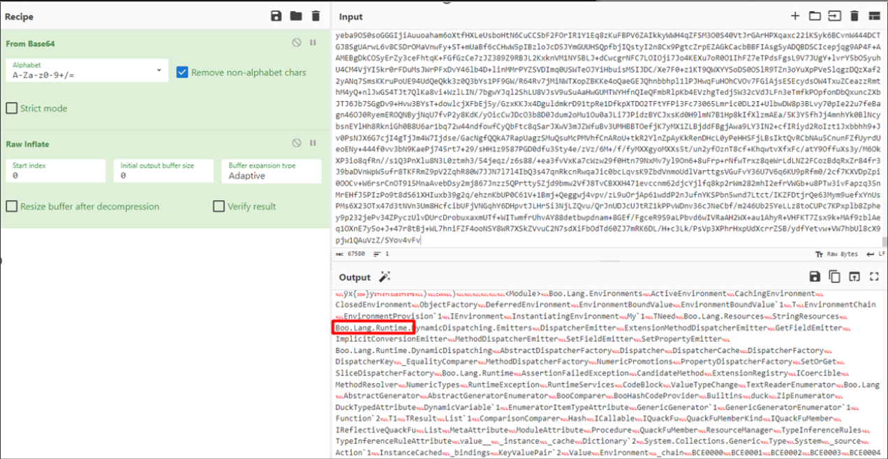 The script could be easily decompressed and decoded on CyberChef to show its embedded plaintext Boolang hardcoded in the PowerShell script.