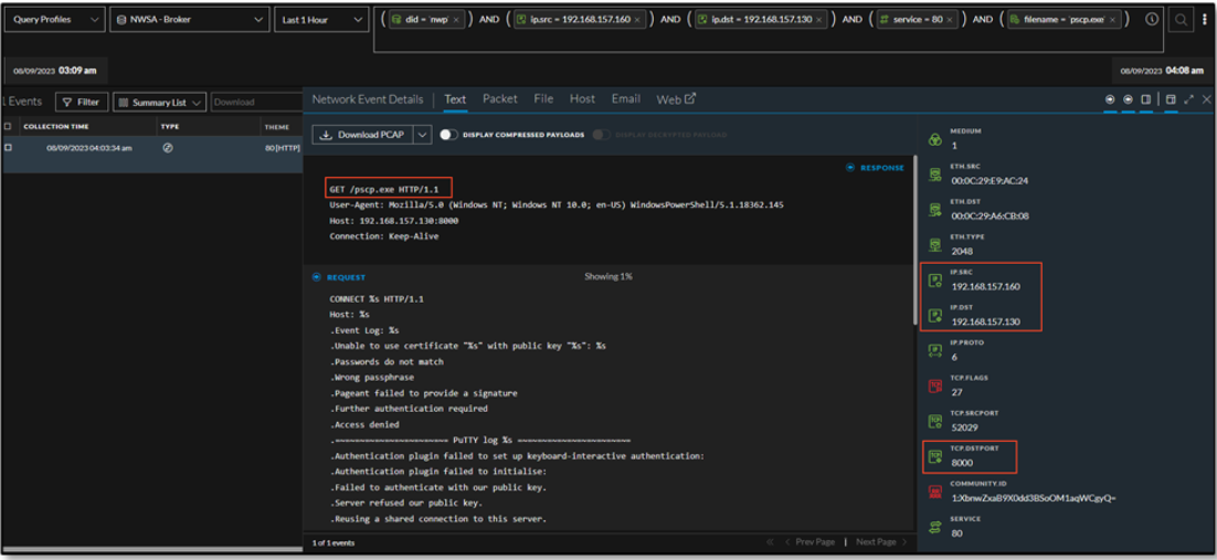 The analyst also observed the transfer of pscp.exe file to the victim machine, through an HTTP GET Request captured by NWP.