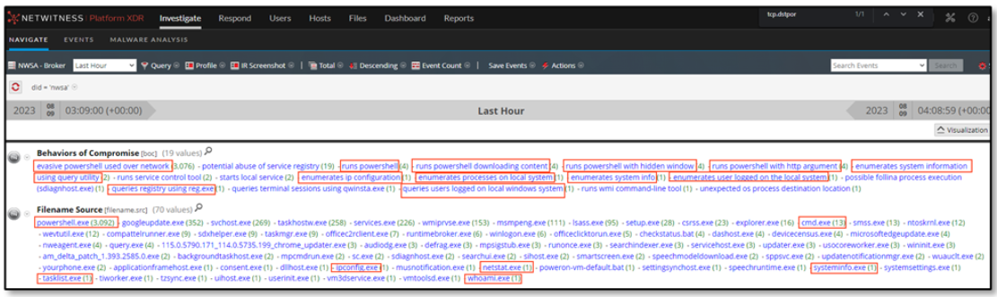The analyst analyzed each BOC values and started pulling the threads to get a more holistic view of the suspicious behaviors detected.